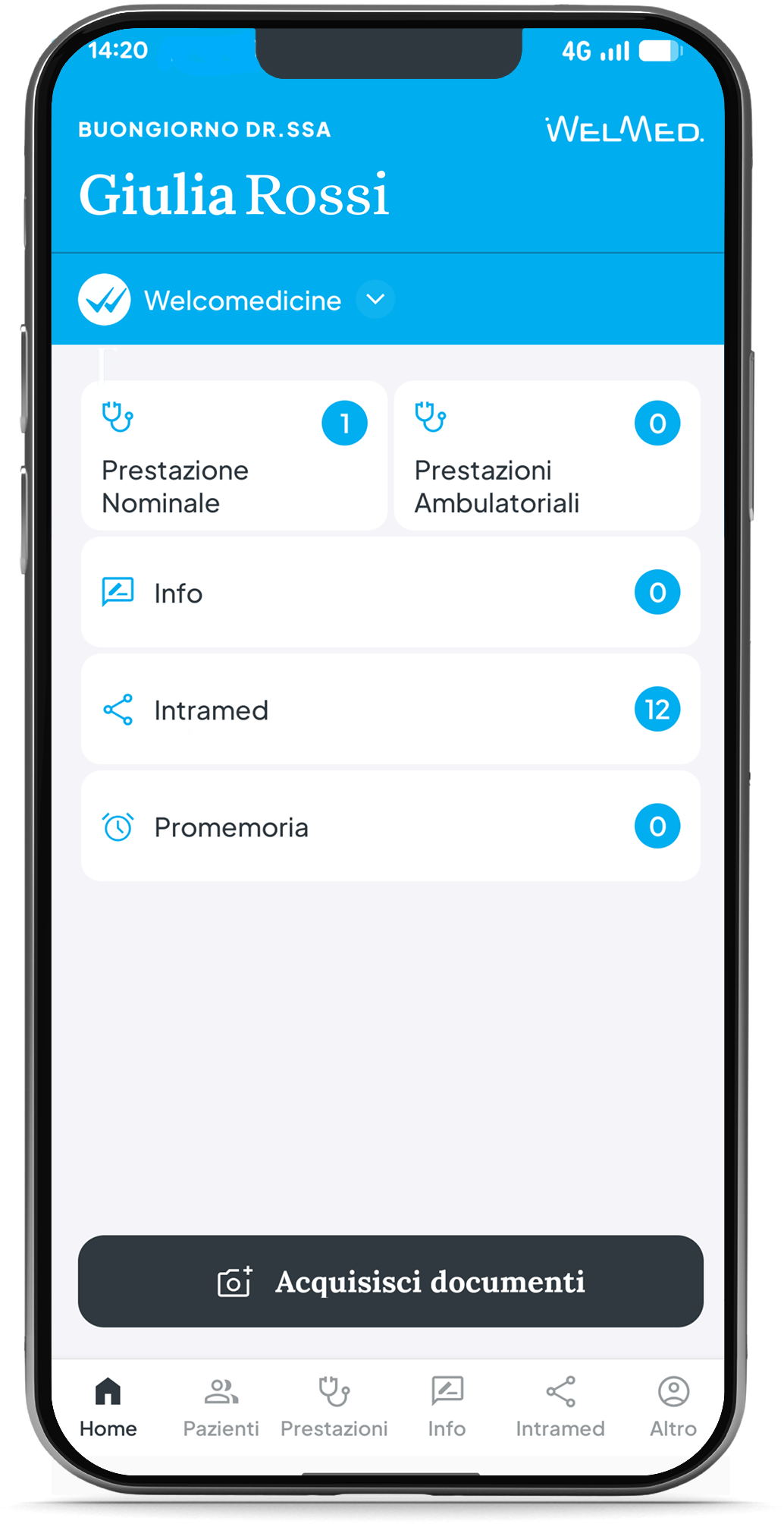 La Piattaforma è navigabile da qualsiasi dispositivo: computer, tablet e smartphone. Puoi accedere alla tua area riservata con le tue credenziali da welcomedicine.it oppure scaricare l’App WelMed Pro per dispositivi Android e iOS e accedere tramite credenziali o riconoscimento biometrico (impronta digitale e riconoscimento facciale).
